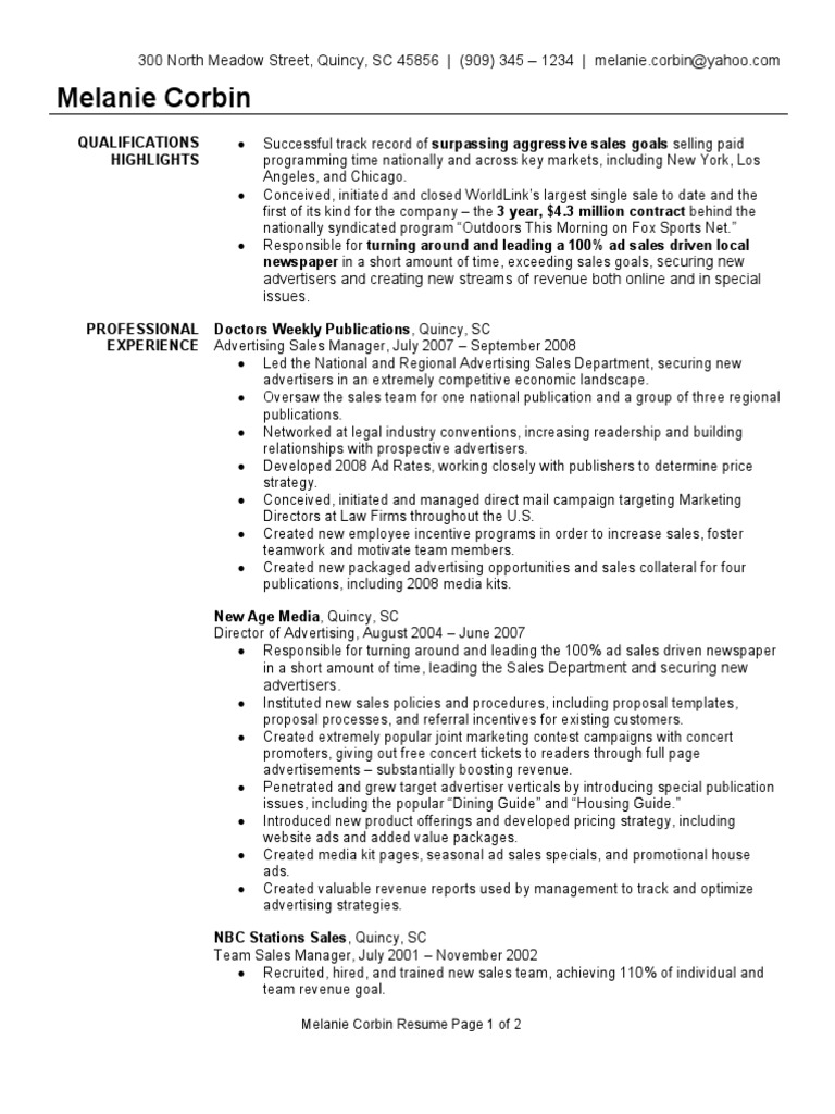 sample ad sales resume